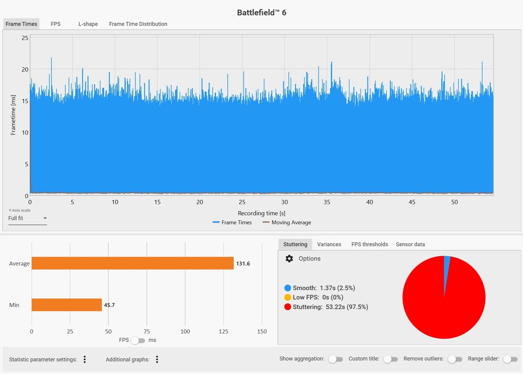 Igualmente interesante es el rendimiento con la generación de fotogramas activada, que probamos con los portátiles RTX 5080 y RTX 5090 (véase la tabla). Como era de esperar, habilitar la función proporciona un aumento sustancial de FPS -especialmente con MFGx4-, pero a costa de tiempos de fotogramas menos consistentes, como se muestra en las capturas de pantalla de CapFrameX.