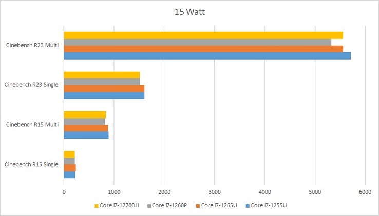 El funcionamiento a 45W muestra claramente una gran diferencia entre las CPUs y que los núcleos son muy ineficientes a frecuencias muy altas. Comparado con 35W, el Core i7-1255U (no pudimos probar el i7-1265U a 45W sostenidos) es sólo un 4% más rápido a pesar de un 28% más de energía. La decisión entre el Core i7-1260P y el Core i7-12700H también es muy sencilla, ya que la CPU de la serie H tiene una gran ventaja gracias a sus seis núcleos P.