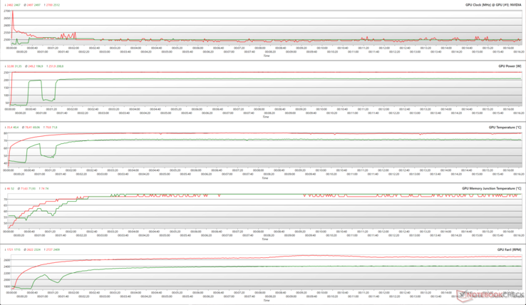 Sin embargo, esta frecuencia no se mantiene durante mucho tiempo, y los relojes medios se acercan a la marca de los 2.500 MHz a 250 W con unas temperaturas medias del núcleo de 78,4 °C.