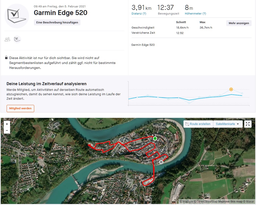 Para evaluar la precisión del posicionamiento en la práctica, realizamos un seguimiento de una ruta en paralelo con un Garmin Edge 520 a modo de comparación. Entre el módulo GPS del smartphone y el dispositivo de navegación hay unos 140 metros al final de la ruta de prueba de cuatro kilómetros. Por lo tanto, las desviaciones de distancia no son demasiado grandes, y si se evalúa el curso detallado del seguimiento GPS, el teléfono Samsung es muy adecuado para navegar en coche debido a su sólida precisión de posicionamiento.