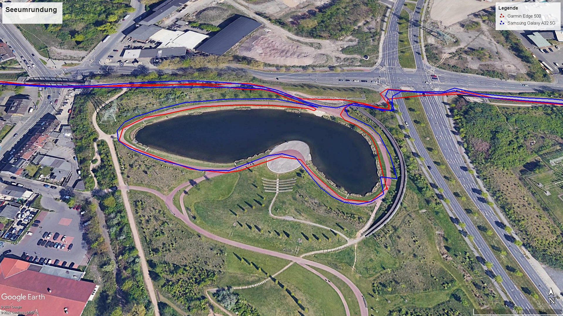 El smartphone Galaxy tiene que enfrentarse a una comparación con el Garmin Edge 500 en un corto paseo en bicicleta. Las desviaciones en la ruta general se mantienen dentro de los límites, y un vistazo a la ruta detallada también muestra un rendimiento similar en la determinación de la posición que el ordenador de bicicleta.