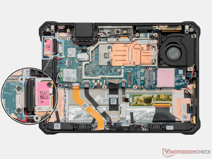 Una vez dentro, los usuarios tienen acceso al módulo WLAN M.2 extraíble, la ranura WAN M.2 y la ranura SSD M.2 2230. El paquete de baterías interno también estará presente si está configurado con uno.