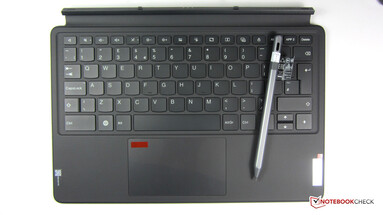 El Lenovo Tab Pen Plus disponible por separado soporta 4096 niveles de detección de presión e inclinación y se conecta a la tablet por Bluetooth. El lápiz de 13 gramos se adapta bien a la mano y facilita dibujar o escribir en la tableta. El paquete de teclado opcional consta de un teclado con panel táctil y una cubierta para escribir con soporte desplegable. Sin embargo, no hay iluminación del teclado.