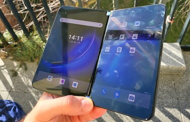 Las dos pantallas AMOLED de 90 Hz del Duo 2 tienen una resolución de 1.344 x 1.892 píxeles y una relación de aspecto de 13:9, algo inusual en un smartphone. El resultado es una densidad de píxeles de unos 400 PPI en cada pantalla. Cuando se abre, el modelo Surface ofrece una diagonal de pantalla de 8,3 pulgadas, que se ve interrumpida por la bisagra en el centro