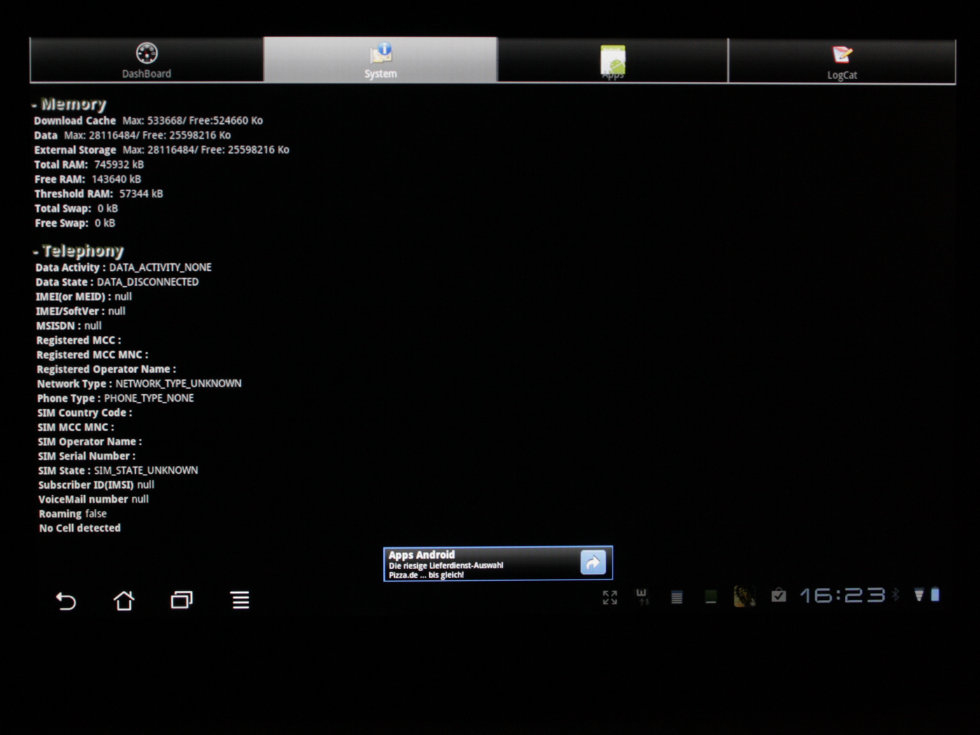 Medimos el valor de negro con el brillo al máximo en el centro y determinamos 0.47 cd/m2. Es un buen resultado, pero no un contraste perfecto con 626:1. El negro no se ve tan extremadamente oscuro y fresco como, por ejemplo, en BlackBerry Playbook (780:1), iPad 2 (843:1), Iconia Tab W500 (881:1), Galaxy Tab 10.1 (805:1) o Motorola Xoom (1491:1) con colores extremadamente vívidos.