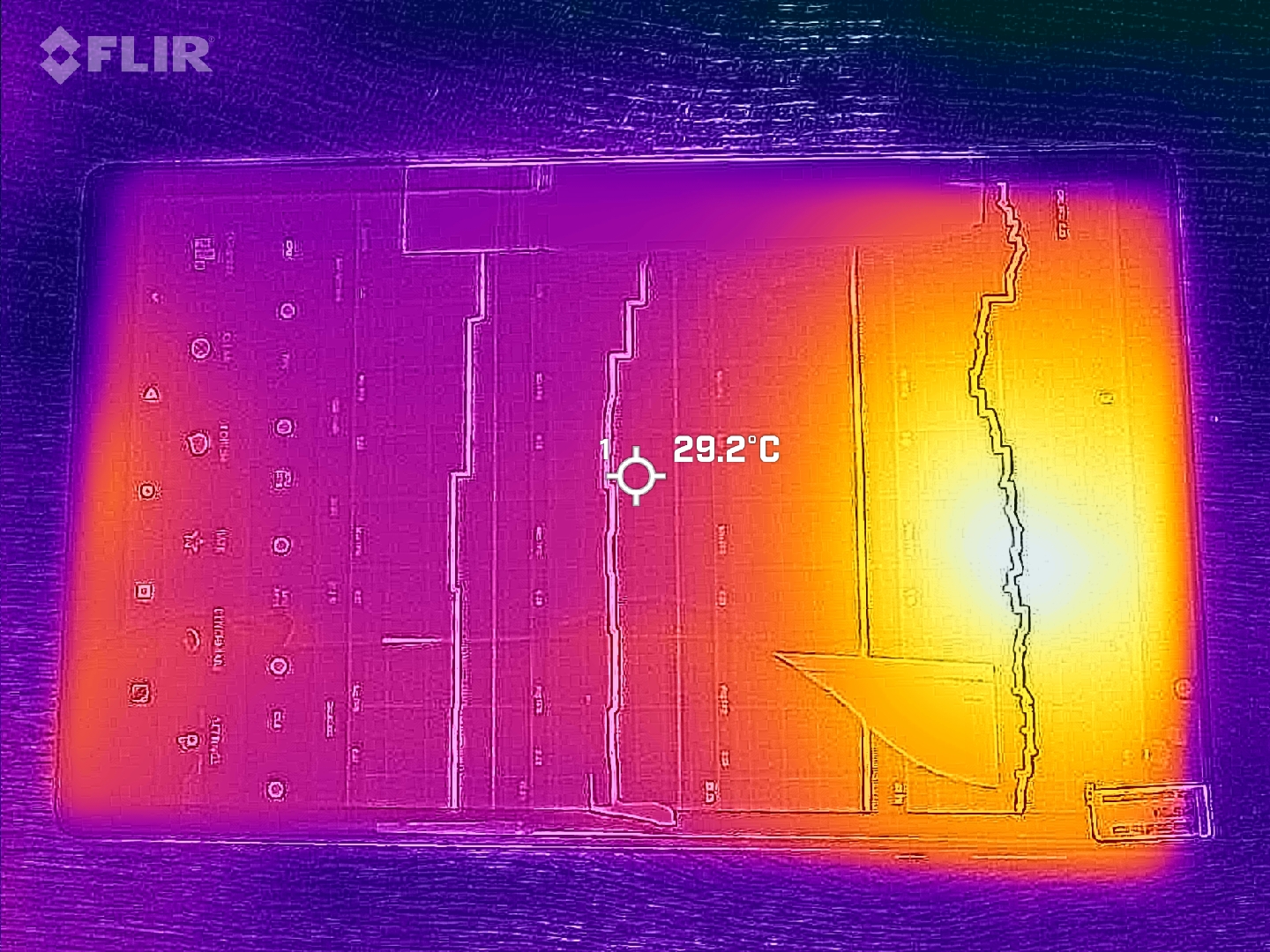 (+) En reposo, la temperatura media de la parte superior es de 25.6 °C / 78# F, frente a la media del dispositivo de 30 °C / 86 F.