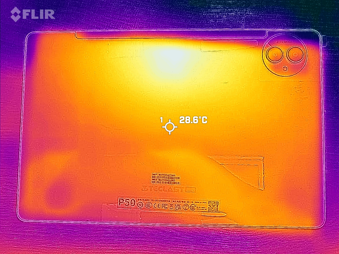 El Teclast P50 es muy estable bajo carga. Como demostraron las pruebas de estrés Wild Life de 3DMark, puede utilizar todo su rendimiento prácticamente en cualquier momento. Sólo medimos un máximo de 36,6 °C en la superficie de la tableta después de que el benchmark Burnout hubiera utilizado todo su rendimiento durante una hora seguida.