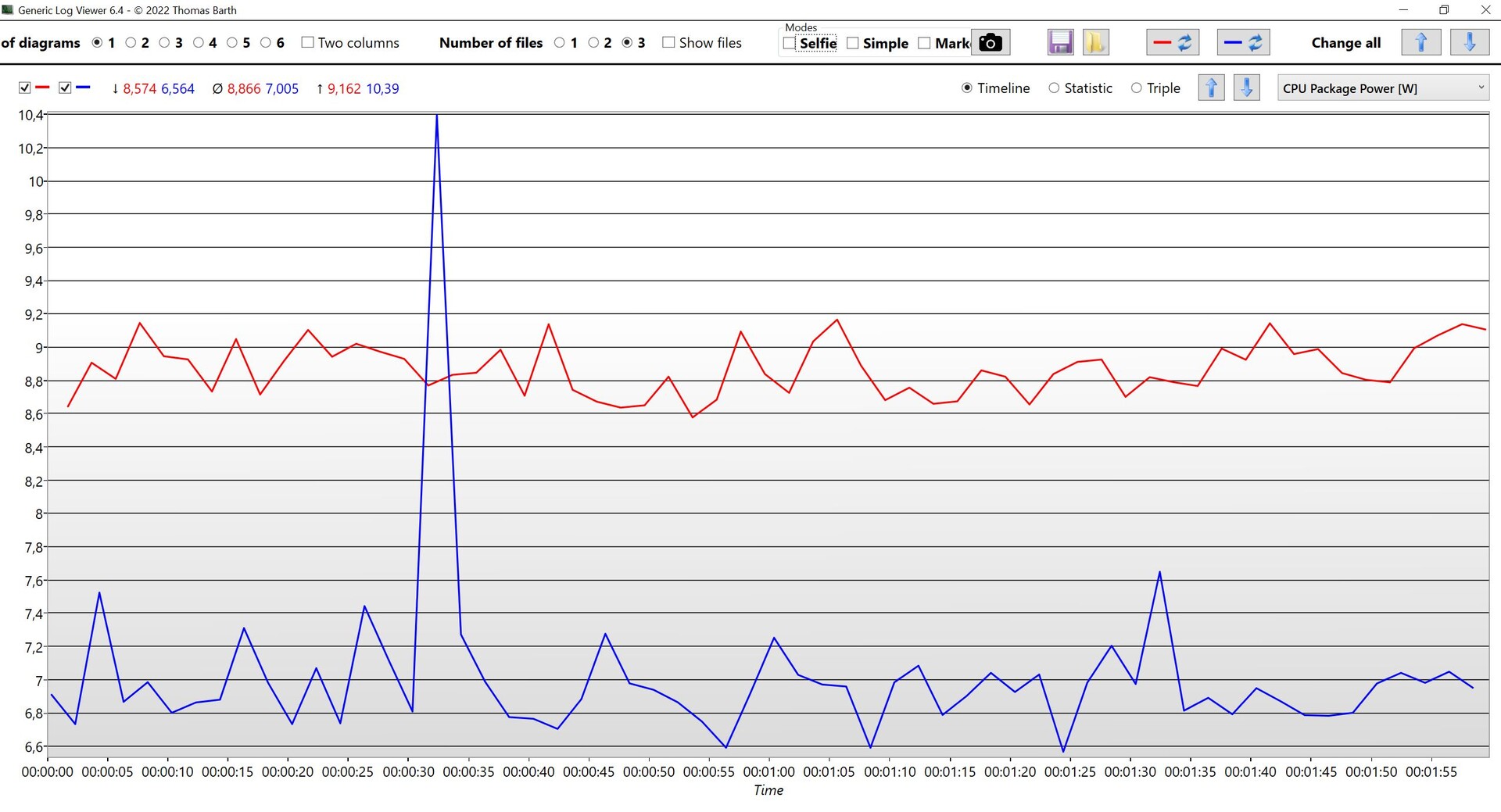 También comparamos el consumo de energía del nuevo Core i9-14900HX en modo inactivo con el del AMD Ryzen 9 7945HX3Den el que los ajustes de rendimiento se mantuvieron lo más cerca posible en ambos modelos. Aquí, observamos que el Core i9-14900HX tenía una ligera ventaja, equilibrándose en torno a los 7 vatios en un escenario ideal. El Ryzen 9 7945HX3D con su diseño de chiplet, por otro lado, requirió un promedio de 8,9 vatios en reposo.