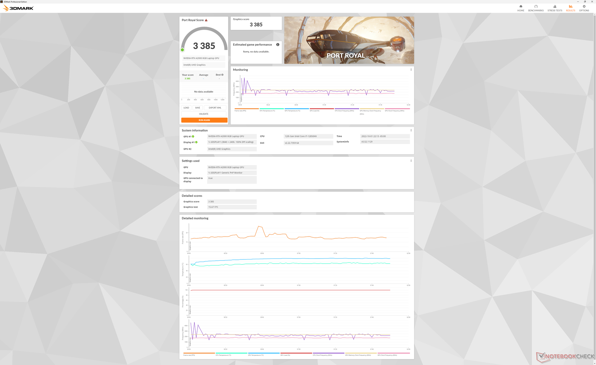Cuando se ejecuta Witcher 3 para representar una carga pesada constante, las velocidades de reloj de la GPU, la temperatura y el consumo de energía se estabilizan en 1777 MHz, 80 C y 80 W, respectivamente, en comparación con 1462 MHz, 75 C y 45 W, respectivamente, en la Precision 5560 más pequeña con la misma GPU RTX A2000.
