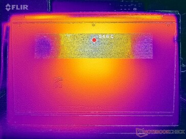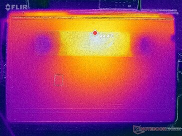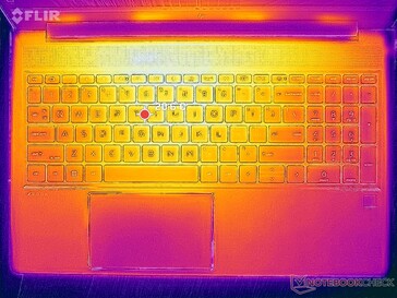 Las temperaturas superficiales son más cálidas hacia el centro y más frías a lo largo de los laterales del teclado o los bordes del chasis. Los puntos calientes en el centro y la parte inferior del teclado pueden alcanzar más de 42 C, lo que supone varios grados menos que en el modelo de la competencia ThinkPad P1 G6 con la misma GPU RTX 2000.