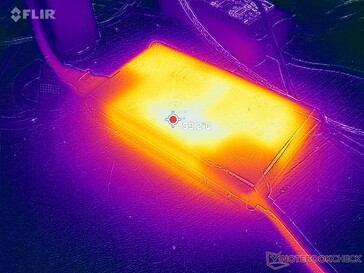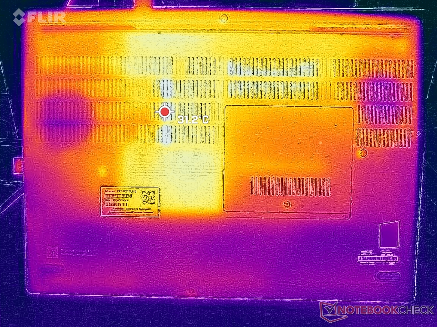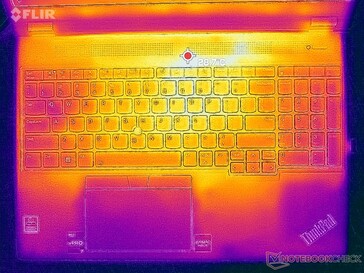 Las temperaturas superficiales son más cálidas de lo esperado incluso en reposo sobre el escritorio sin aplicaciones en ejecución. La parte inferior, por ejemplo, puede alcanzar los 37ºC comparado con los 31ºC del Precision 7670. Si se ejecutan cargas más altas, estos mismos puntos calientes del Lenovo pueden alcanzar los 49 C o más, mientras que el centro del teclado puede llegar a los 40 C. Las temperaturas de la piel pueden resultar incómodas si el portátil está sobre el regazo en lugar de sobre una mesa.