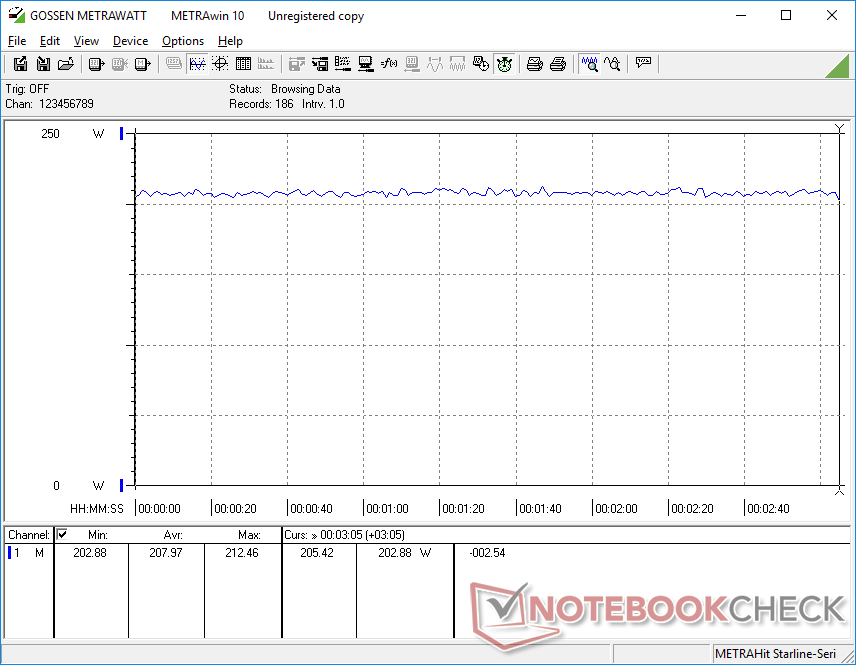 En segundo lugar, el adaptador de CA de 230 W está sudando la gota gorda intentando alimentar una CPU de más de 100 W y una GPU de 130 W. La lucha se observa cuando se ejecuta una CPU exigente. La lucha es observable cuando se ejecutan cargas exigentes, ya que la tasa de carga del sistema se ralentiza significativamente o incluso empieza a agotar la batería en ciertos escenarios. Cuando somos capaces de medir un consumo máximo de 285 W con un adaptador de CA de sólo 230 W, está claro que hay un cuello de botella. Un adaptador de CA mayor de 280 W o 330 W habría sido más apropiado dado nuestro nivel de configuración.