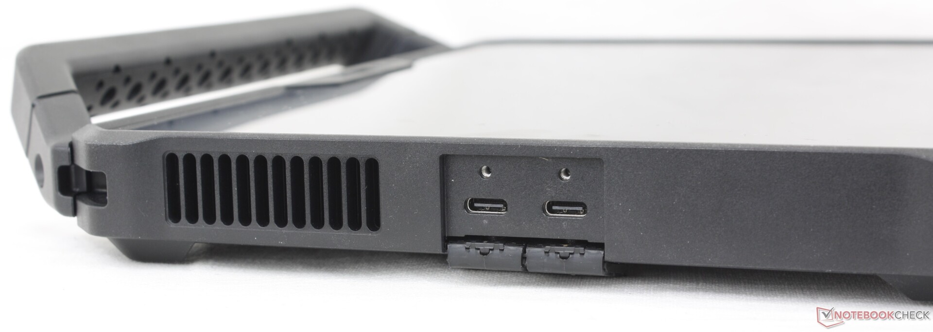 Algunos aspectos molestos de la carcasa son las inestables tapas de los puertos y los esponjosos botones frontales. Las tapas de los puertos son difíciles de agarrar, mientras que los botones de acceso directo podrían ceder un poco más al pulsarlos. El Toughbook FZ-G2 de la competencia hace las cosas un poco mejor en este sentido.