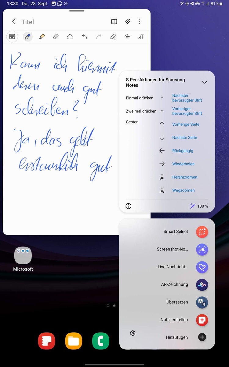 El S-Pen también impresiona por sus numerosas funciones. Un breve menú permite acceder a las aplicaciones y acciones vinculadas. El lápiz activo también tiene un botón que puede vincularse a varias funciones y aplicaciones adicionales. También permite escribir en la pantalla de bloqueo. Además, es posible abrir varias aplicaciones en modo de pantalla dividida. Sin embargo, sin una cubierta, el lápiz queda desprotegido en la parte trasera de la tableta y podría perderse fácilmente.