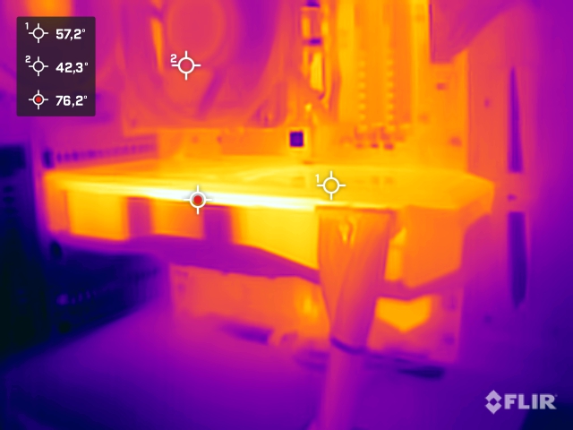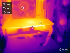 La carcasa que ya hemos criticado, con su limitada entrada de aire fresco, también pasa factura a los componentes instalados. En total, nunca alcanzamos temperaturas críticas durante nuestra prueba. Aún así, pudimos ver - o escuchar - cuánto luchaban los ventiladores para enfriar el hardware. Durante la prueba de estrés Prime95, medimos un valor no crítico de 72 °C, pero esto se debe a su bajo consumo de 77 vatios. Si además sometemos a estrés al acelerador 3D, las temperaturas de la CPU suben a unos 82 °C. La tarjeta gráfica parece un poco diferente aquí. Notamos puntos calientes de la GPU de 87 °C y la VRAM incluso alcanzó los 100 °C. Quitar la parte lateral ayuda a mejorar la situación, pero no es ni práctico ni deseado. De nuevo tenemos que enfatizar lo importante que es la elección de la carcasa para garantizar un buen flujo de aire dentro del sistema.