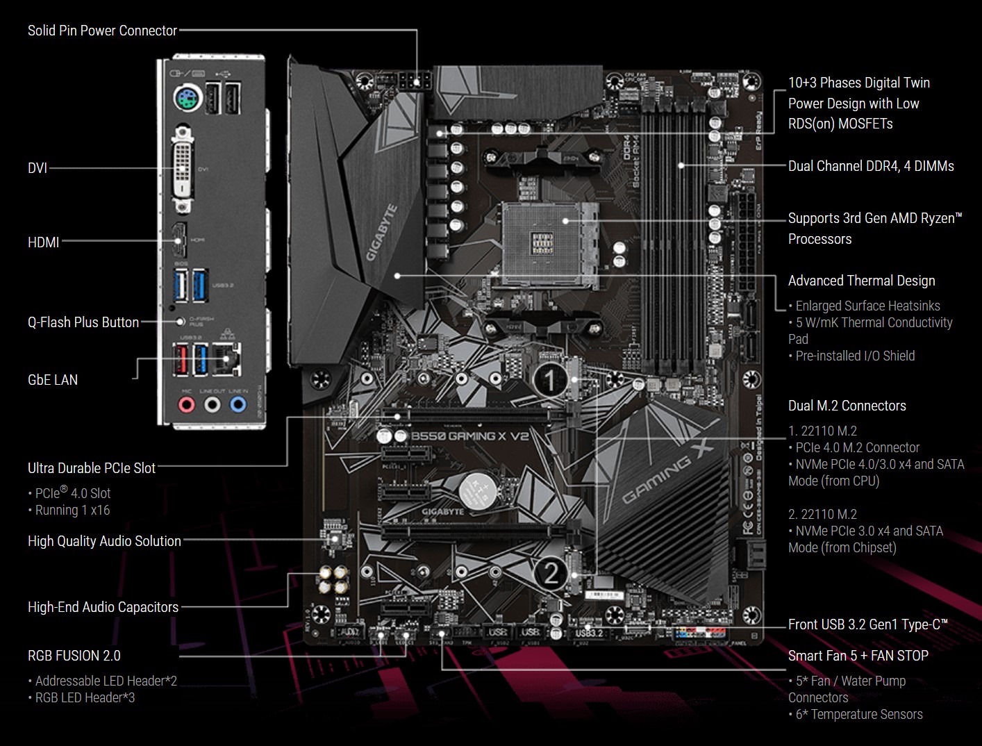 En cuanto a las opciones de conectividad, estás limitado a lo que permite la placa base instalada. Nuestro sistema de pruebas está equipado con la Gigabyte B550 GAMING X V2, de la que adjuntamos una foto. La parte trasera tiene suficientes conexiones USB e internamente, también te recompensan con opciones de conectividad bastante buenas. Al mismo tiempo, hay que tener en cuenta que se trata de una buena placa base de gama media que actualmente se puede encontrar por unos 110 dólares. Sin embargo, Memory:PC también ofrece otras placas base que pueden ser más baratas o más caras en función de sus características. A la hora de hacer un pedido, puedes elegir entre varios modelos. Por tanto, si buscas un modelo con módulo WLAN integrado, tendrás que elegir otro, ya que la configuración de nuestra muestra de prueba no lo ofrece.