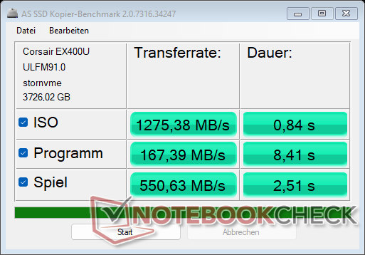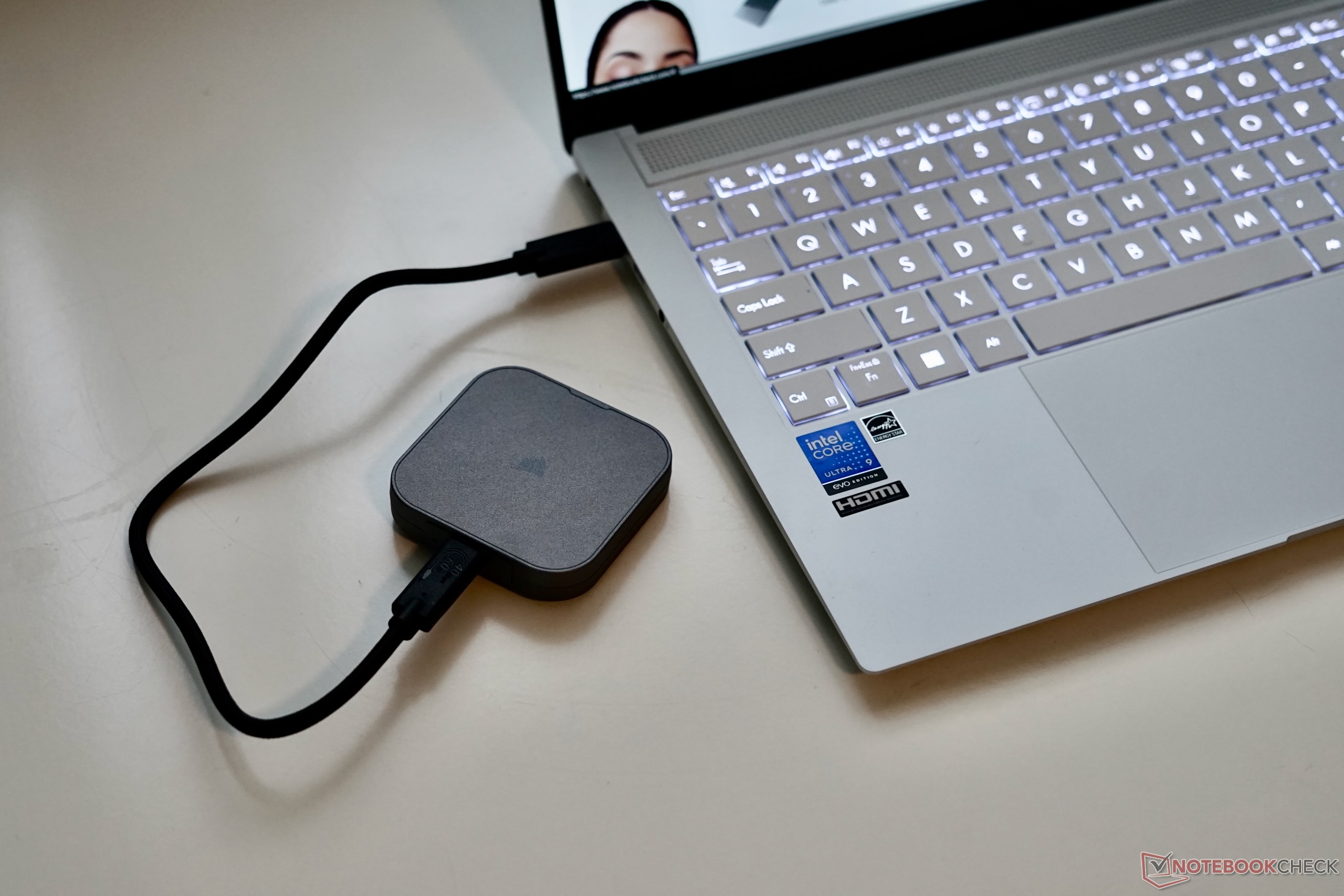 Medimos el rendimiento del medio de almacenamiento externo en varios dispositivos. Utilizando el Asus Zenbook OLED con el rápido Intel Core Ultra 9 288V, alcanzamos excelentes valores de rendimiento que incluso superan por poco las especificaciones para lectura secuencial (prueba diskspd). El Corsair tiene un rendimiento excepcional en las pruebas sintéticas de lectura y escritura y tampoco decepciona en las demás pruebas sintéticas. Sin embargo, en la prueba comparativa AS SSD Copy, el rendimiento queda claramente por detrás de las rápidas unidades SSD integradas.
