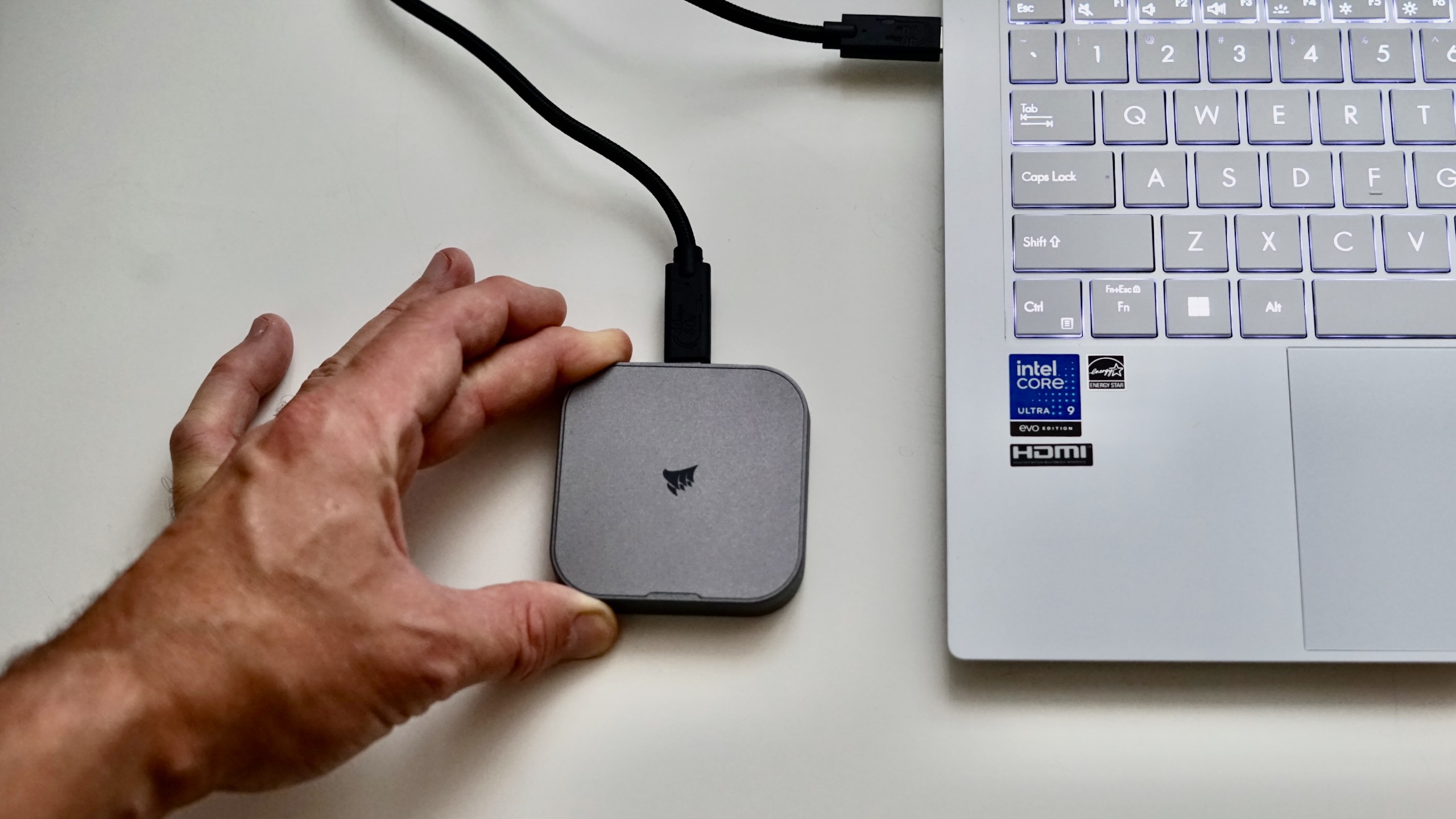 La Corsair EX400U es una unidad SSD externa extremadamente rápida con interfaz USB4. En nuestras pruebas comparativas incluso superó los 4.000 MB/s anunciados (lectura secuencial diskspd). La compatibilidad también es muy buena y la unidad funcionó perfectamente con dispositivos que ejecutan macOS 26 (M4 Pro MBP14), iPad OS 26 (M4 iPad), ChromeOS (Lenovo Chromebook), iOS (iPhone 16 Pro para ProRes directamente en la SSD) y Windows 11. El chasis es agradablemente pequeño y con el anillo MagSafe integrado en la parte inferior, la SSD también puede montarse prácticamente en un iPhone o incluso en una carcasa metálica de sobremesa. Con el iPhone también puede utilizar la SSD como calentador de manos, ya que el desarrollo de calor es la clara desventaja. La refrigeración a través de la carcasa de aluminio funciona bien para los componentes internos, pero medimos hasta 69 °C bajo carga en la parte superior: ¡algo caliente!