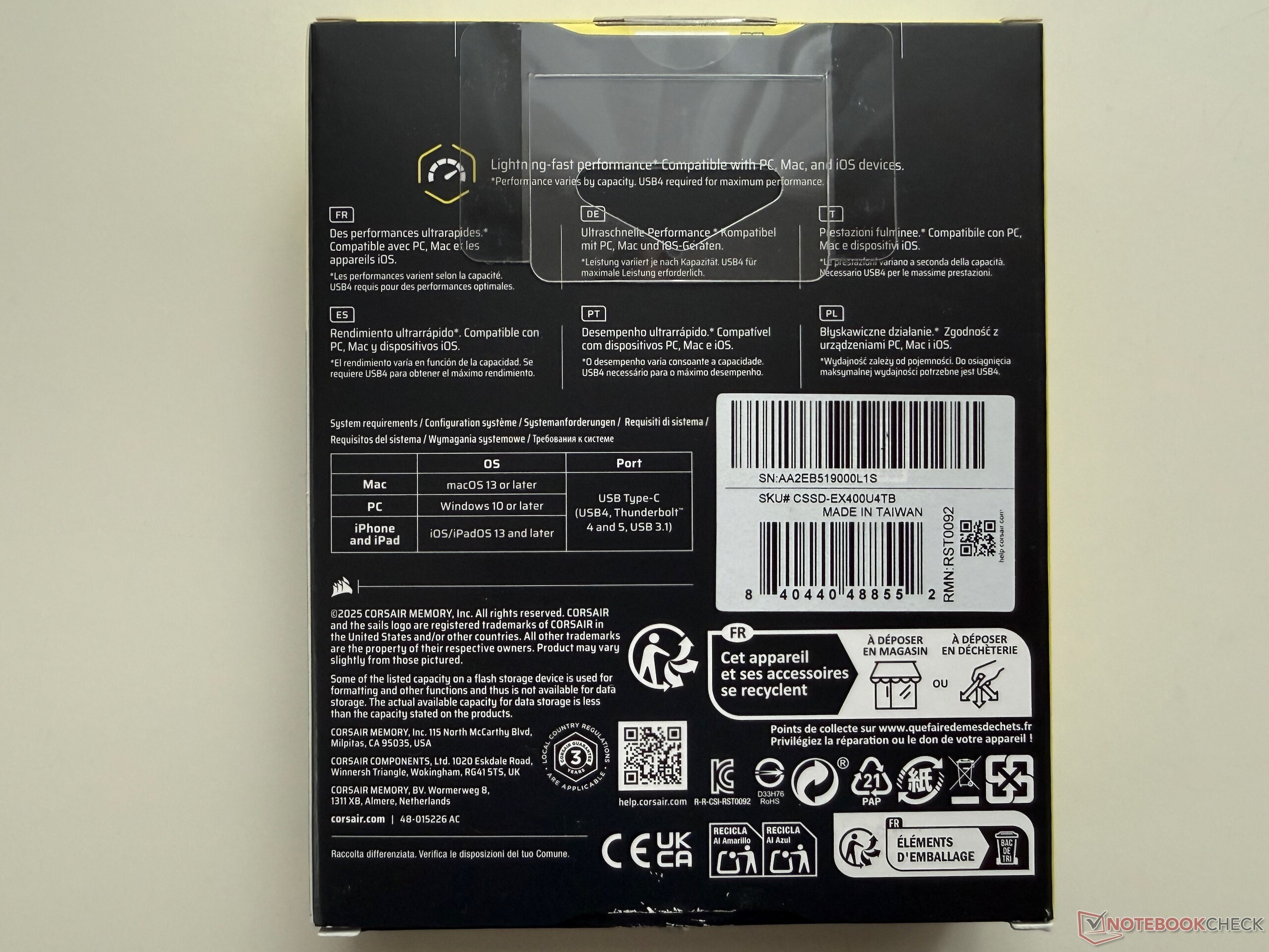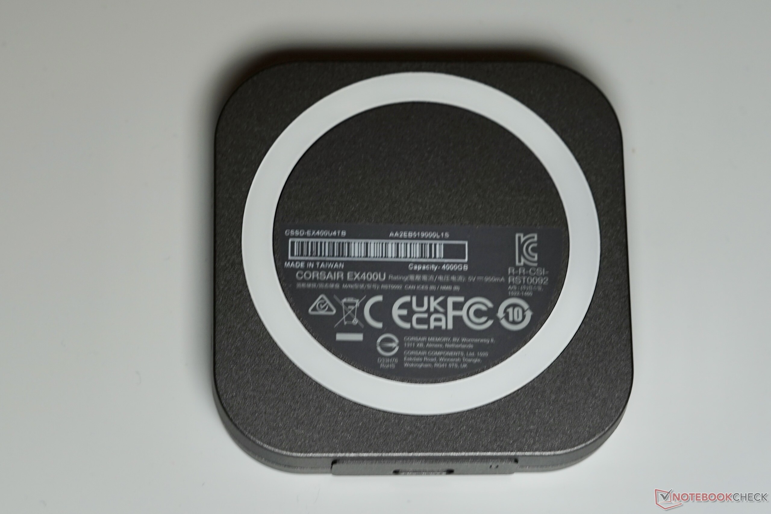 El Corsair EX400U 4TB (CSSD-EX400U4TB) está alimentado por el controlador Phison PS2251, que ofrece soporte USB nativo. Según Corsair, los chips de memoria NAND TLC utilizados son de Kioxia. La SSD ofrece una garantía de 3 años siempre que no se supere el TBW (Tobal Bytes Written) de 1.000 terabytes (para el modelo de 4 TB). Como característica especial, la SSD ofrece un anillo MagSafe en la parte trasera. Esto permite conectar la SSD a todos los iPhones actuales y, por ejemplo, escribir ProRes directamente en la SSD en el iPhone 16 Pro de la prueba.