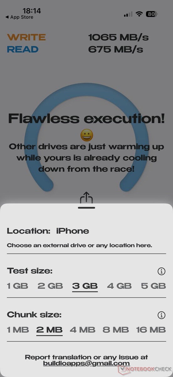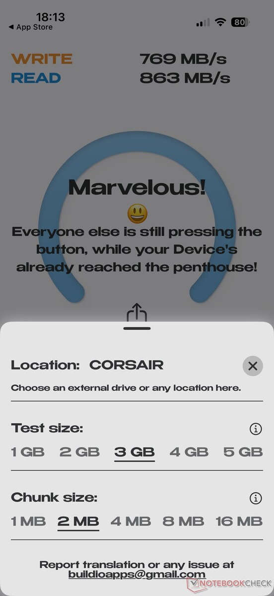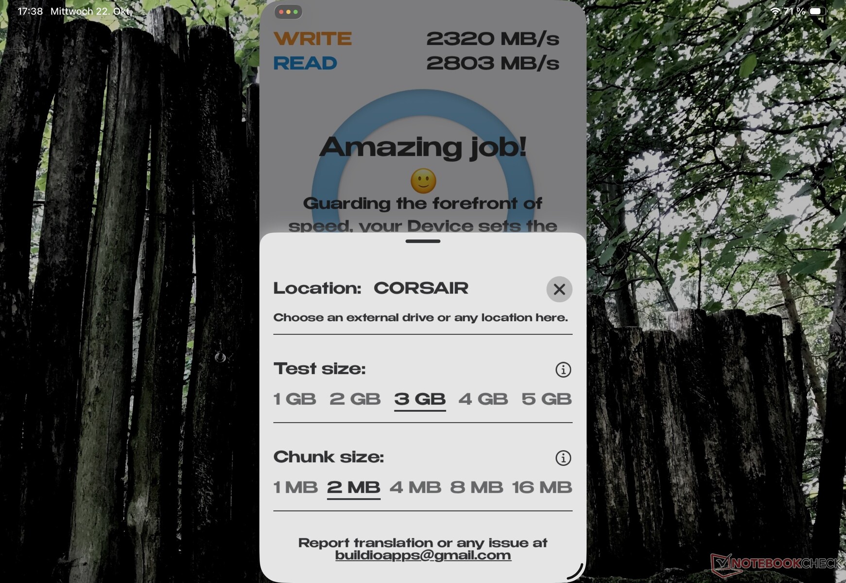 Utilizando un iPad Pro (M4 de 2024 con una SSD base de 256 GB) el rendimiento de la unidad SSD de Corsair es impresionante. Un rendimiento de lectura más del doble de rápido y un rendimiento de escritura un 66% más rápido hablan por sí solos. Sin embargo, no se acerca al máximo de 4.000 MB/s. El iPhone 16 Pro es una historia diferente, ya que el puerto USB permite un rendimiento significativamente menor. El EX400U sólo alcanza 860 / 770 MB/s (lectura / escritura). Sin embargo, al menos en escritura, es incluso ligeramente más rápido que la unidad SSD interna de 128 GB.