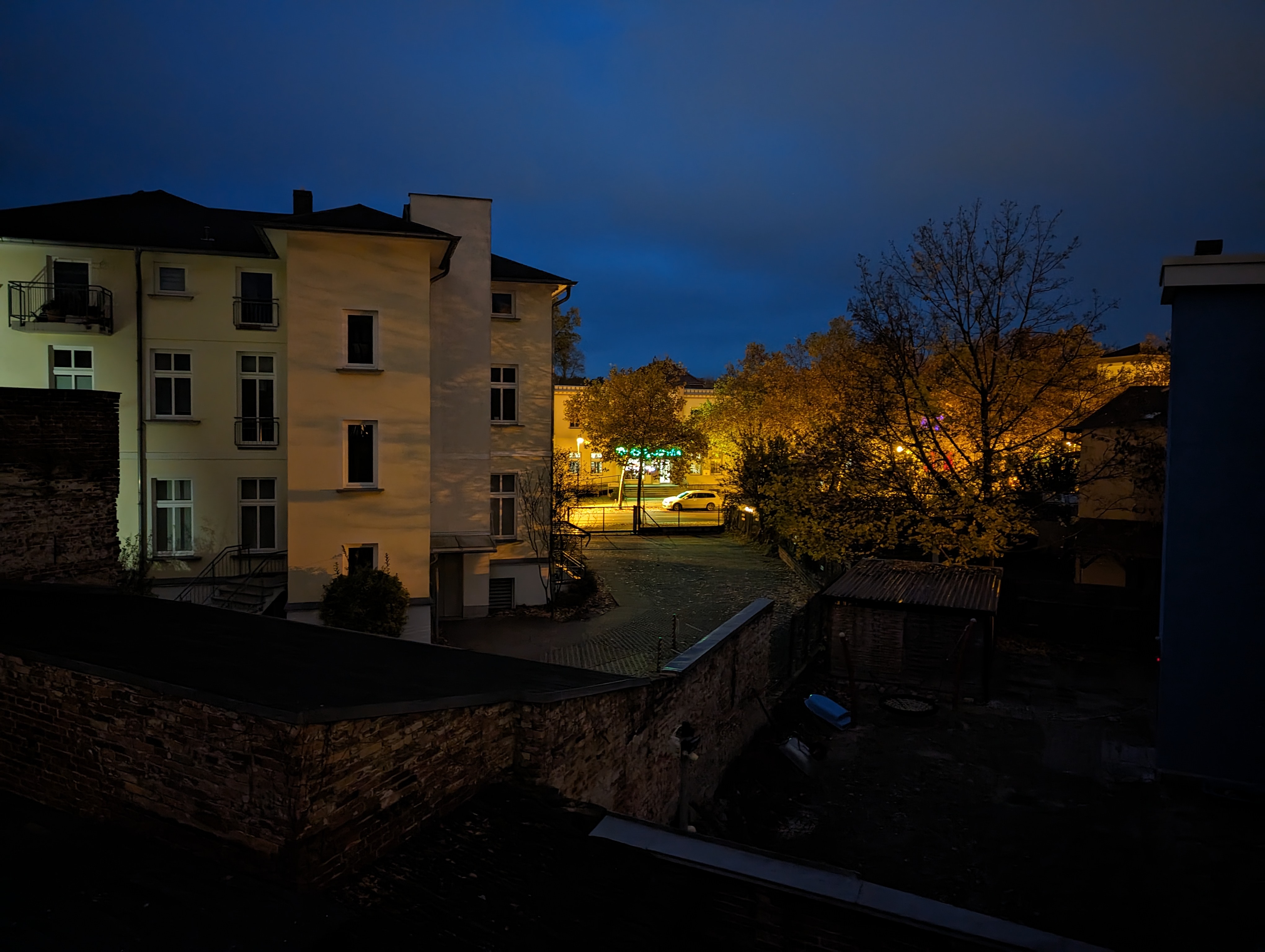 El iPhone 15 Pro Max brilla por la noche. El iPhone capta muy bien la foto de la casa con poca luz, con mucho detalle. Aunque, con un poco más de luz, el Pixel 8 Pro capta las cosas con aún más detalle que el iPhone 15 Pro Max. Los dos smartphones no son tan diferentes. Todavía pueden apreciarse pequeños defectos, como partes de la imagen sobreexpuestas. Las fuentes de luz están ocasionalmente sobreexpuestas, como con los predecesores, lo que probablemente se deba al mayor tiempo de exposición, ya que las duraciones del obturador son sustancialmente más largas que en un Xiaomi 13 Ultra o Galaxy S23 Ultra.