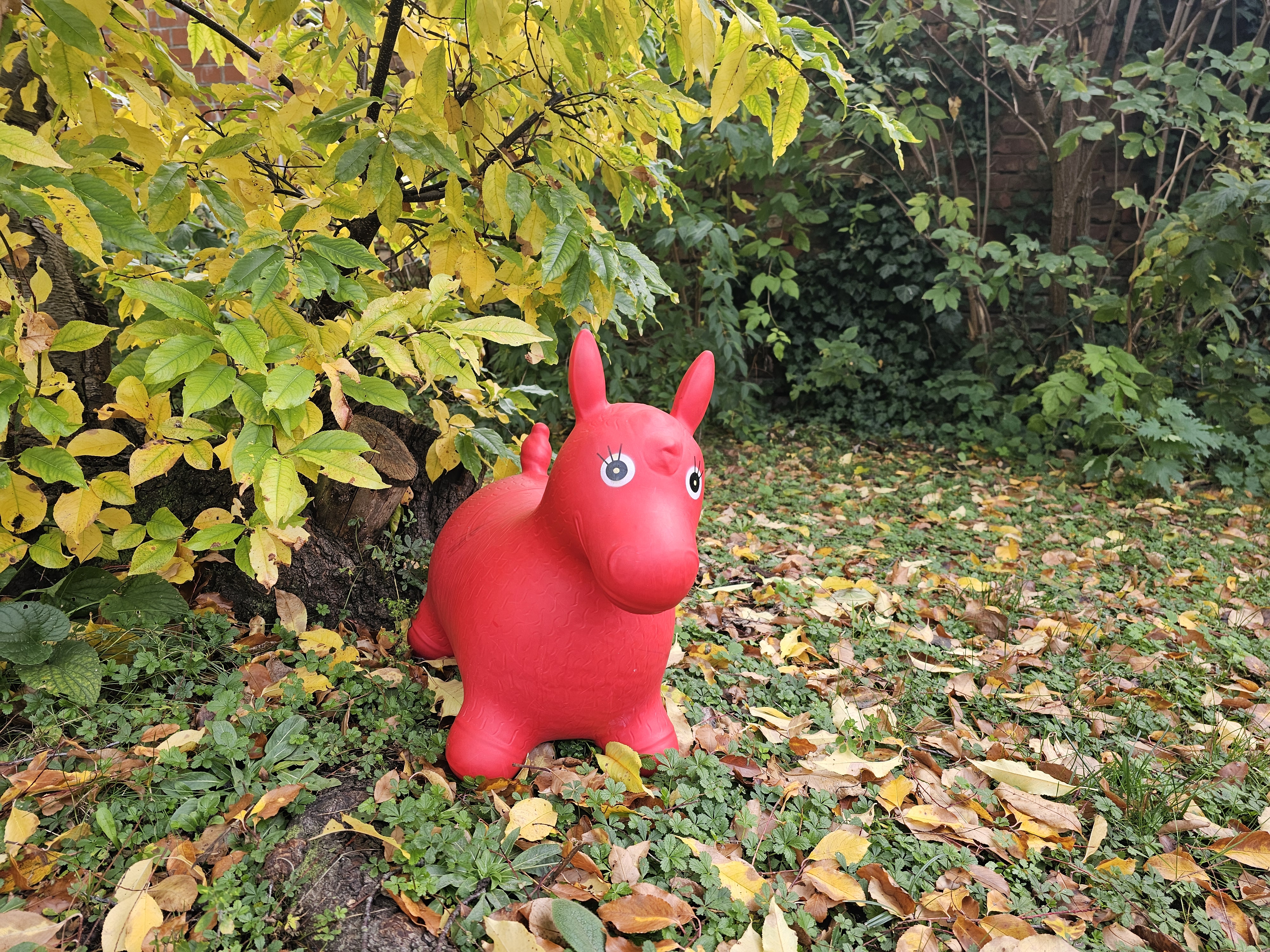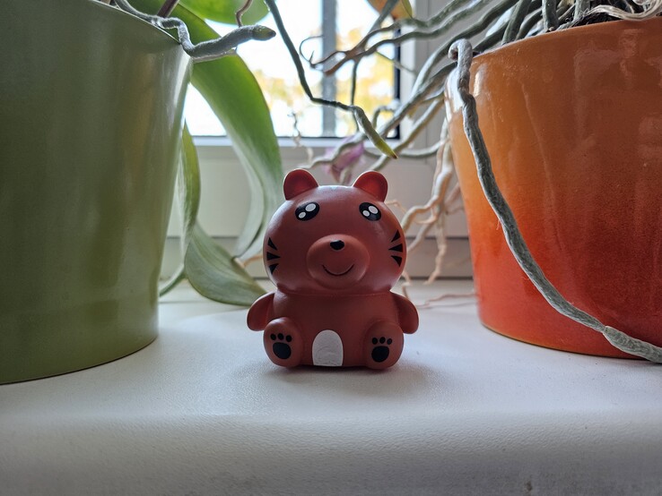 El iPhone 15 Pro Max emerge como el claro inferior en el departamento de la cámara principal en condiciones de luz diurna. El teléfono Apple lucha con una toma desequilibrada de nuestro motivo de la ventana, mostrando características similares al modo macro, a pesar de estar aproximadamente a 1,64 pies del sujeto. Además, los colores del caballo en el jardín carecen de precisión en comparación con los de la competencia Android, que rinde notablemente mejor en este aspecto. A pesar de estos problemas, otras tomas de prueba con el iPhone 15 Pro Max siguen mostrando una buena dinámica y una nitidez atractiva. Sin embargo, la fidelidad del color de los dos peluches no es óptima. Al igual que en la Galaxy S23 Ultra, el gatito está calibrado demasiado cálido, y la rana aparece demasiado brillante.