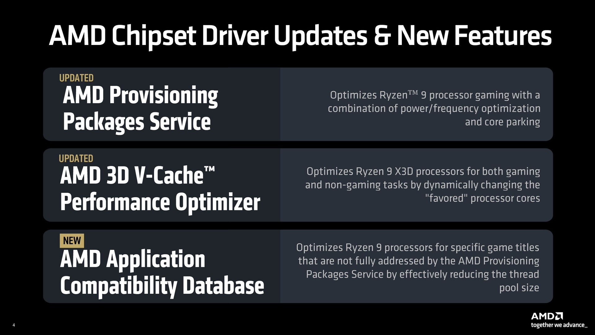 Instalando el último controlador del chipset AMD se obtienen las últimas versiones de los paquetes de aprovisionamiento y el optimizador de rendimiento 3D V-cache exclusivo de la serie Ryzen 9 para un aparcamiento eficaz de los núcleos y la programación de la CPU.