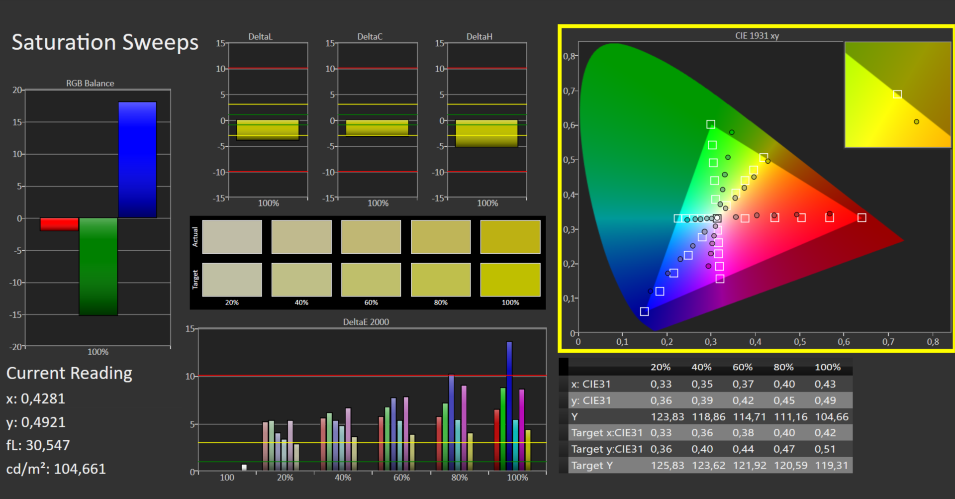 La pantalla muestra los colores correctamente desde el principio: con una desviación de 3,58, el objetivo (DeltaE < 3) no se alcanza por poco. No se recomienda una calibración: aunque se muestra una escala de grises más uniforme, también aumenta la desviación del color a 4,85.