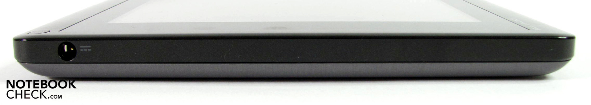 La carcasa causa una impresión bastante buena, lo que se debe particularmente a las superficies con aspecto de aluminio pulido. La estabilidad y manufactura también están bien, incluso si el iPad de Apple están en su propia categoría. El Iconia Tab puede fácilmente sobresalir de la competición, como el Archos 101 o el Toshiba Folio. El peso del dispositivo de pruebas es 940g, mientras que se tienen que sumar 610g extra del Keydock y 190g del adaptador de corriente si quieres llevarlo todo de viaje. Eso es mucho peso para un netbook, y mas aún para un tablet incluso sin los accesorios. Por ejemplo, el iPad 2 pesa 613g y el Samsung Galaxy Tab apenas 380g. Comparados con los 1160g del Asus Eee Slate, el Iconia es algo mas ligero. Las dimensiones de 275mmx190mmx20mm son evidentemente mas grandes que las del iPad, también a causa del display 16:10. Incluso da la sensación de que le cabría una pantalla mas grande al tener un bisel tan ancho.