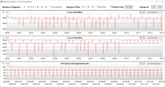 Las temperaturas de la carcasa se mantienen dentro del rango verde en el uso diario (oficina, Internet). El portátil se calienta notablemente bajo carga (test de estrés Witcher 3 test), pero se mantiene dentro de los límites aceptables. Las temperaturas de la CPU alcanzan a veces la zona roja. En consecuencia, el reloj de la CPU cae significativamente en el transcurso de la prueba.