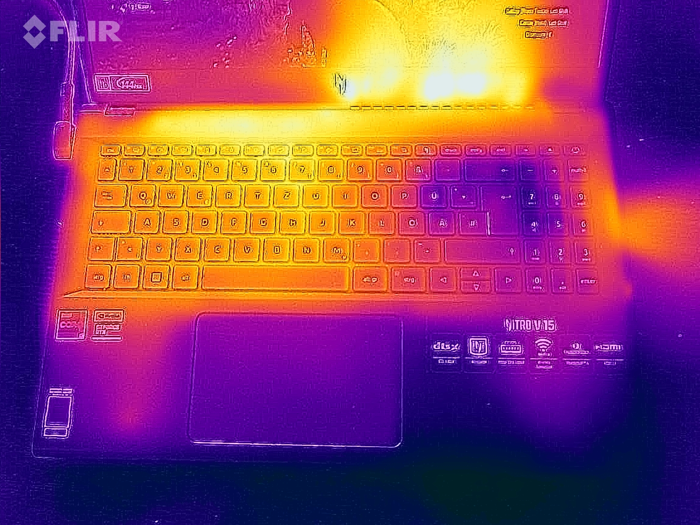 El Nitro V 15 no se calienta en exceso. Incluso tras 60 minutos de pruebas de estrés (ejecutando FurMark y Prime95), la superficie del portátil se mantuvo por debajo de la marca de los 50°C (122°F). Todo el chasis se mantiene agradable y fresco en reposo - nuestro termómetro sólo informó de temperaturas entre 22 y 28°C (71,6 y 82,4°F).
