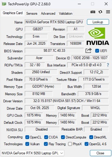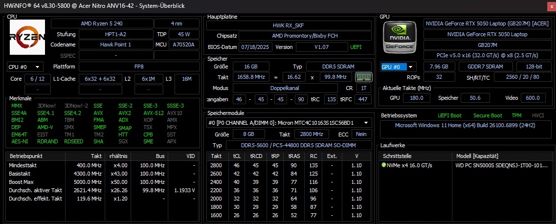 | Acer Nitro V 16 AI ANV16-42-R860 AMD Ryzen 5 240 ⎘ NVIDIA GeForce RTX 5050 Laptop ⎘ 16 GB Memoría, 1024 GB SSD | Amazon: $989.00 Precio de catálogo: 1100 EUR | 2.4 kg | 24.5 mm | 16.00" 1920x1200 142 PPI IPS | |