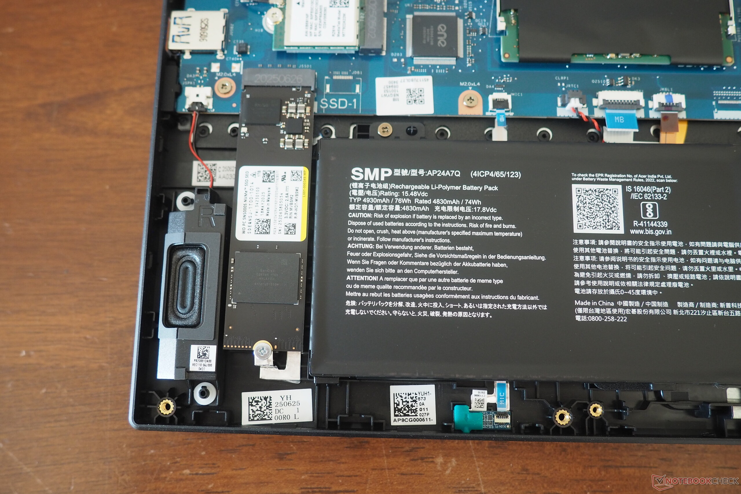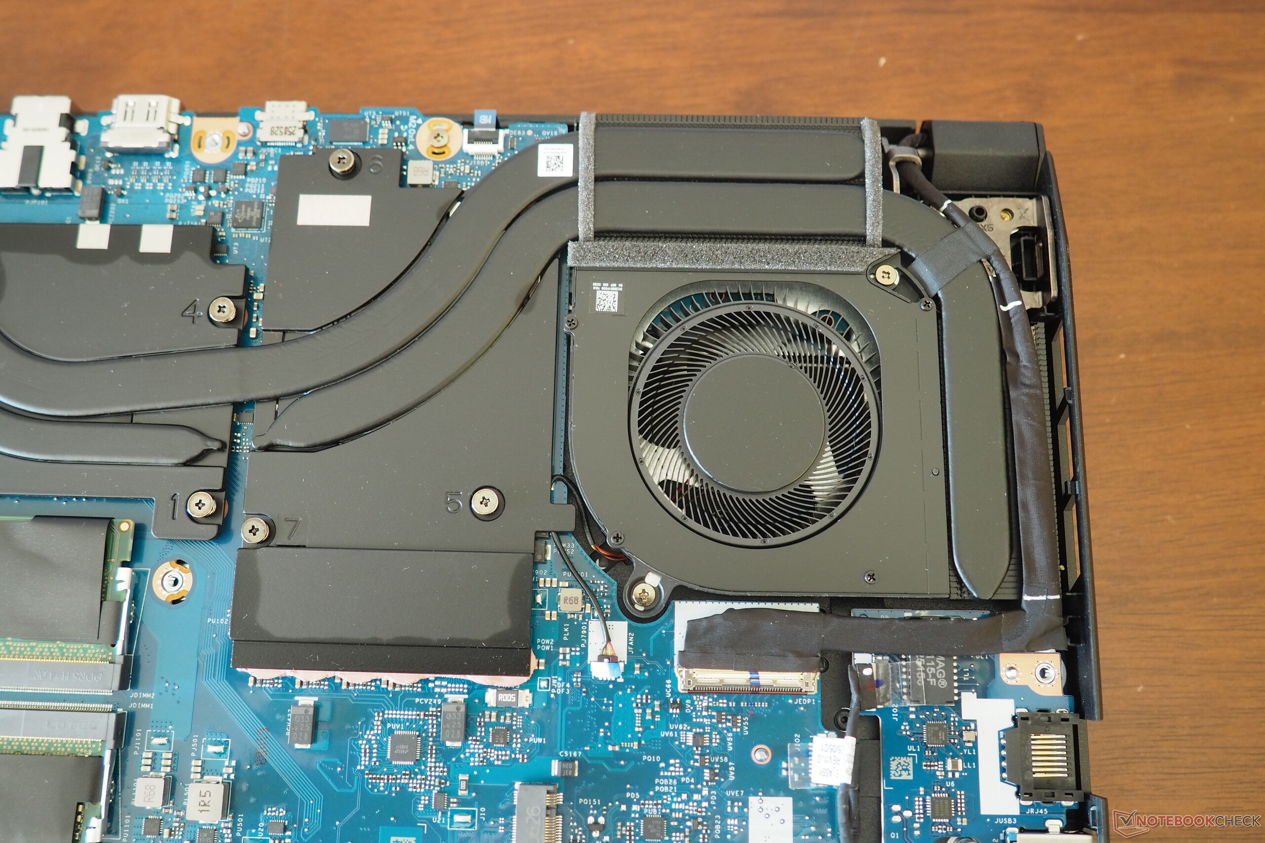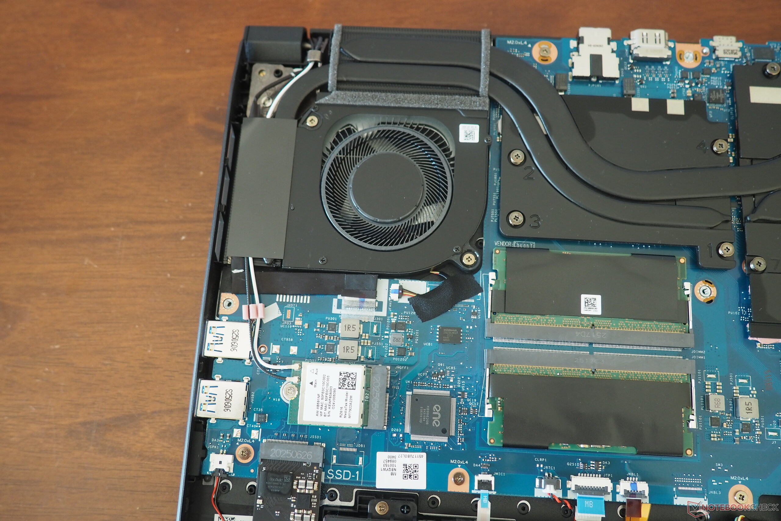 Hay que aflojar un total de 10 tornillos Phillips para acceder a su interior. Bajo el capó, además del sistema de refrigeración con sus dos ventiladores, se encuentran el módulo inalámbrico, la batería, dos SO-DIMM y dos ranuras M.2.