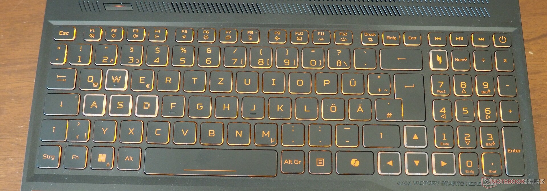 El ángulo máximo de apertura de unos 145° es superior a lo que suele verse en esta clase. La iluminación del teclado es naranja a juego con el color de las letras de las teclas.