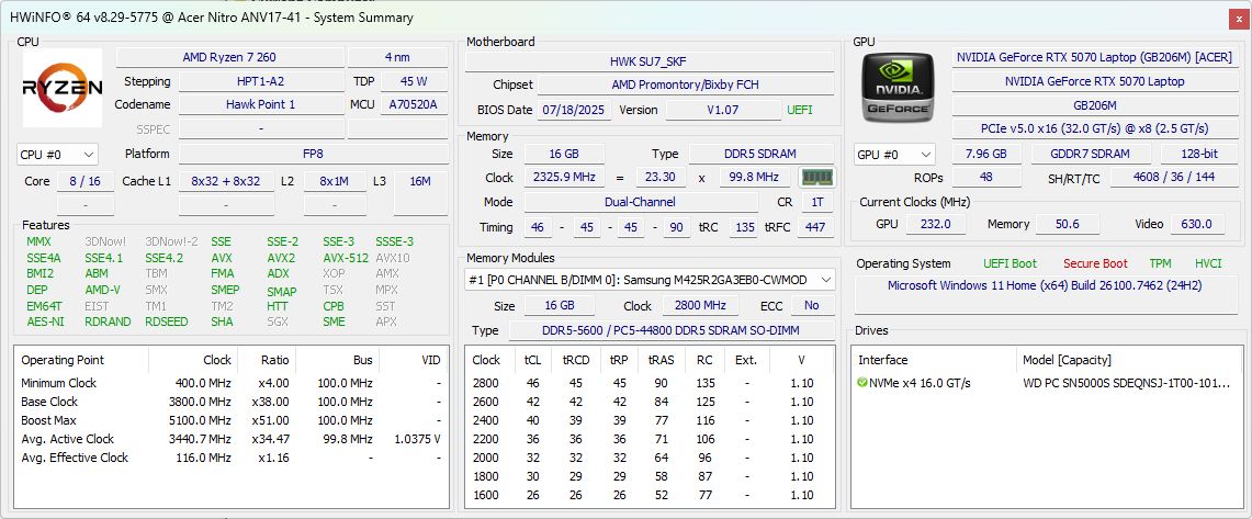 | Acer Nitro v 17 (ANV17-41-R4CJ) AMD Ryzen 7 260 ⎘ NVIDIA GeForce RTX 5070 Laptop ⎘ 16 GB Memoría, 1024 GB SSD | Precio de catálogo: 1199 Euro | 2.7 kg | 24 mm | 17.30" 1920x1080 127 PPI IPS | |