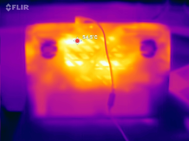Los puntos calientes de juego alcanzan unos 40 °C, mientras que la parte inferior puede calentarse hasta 50 °C bajo carga máxima. La cubierta del teclado se mantiene más fría en general, especialmente los reposamuñecas y la zona WASD.