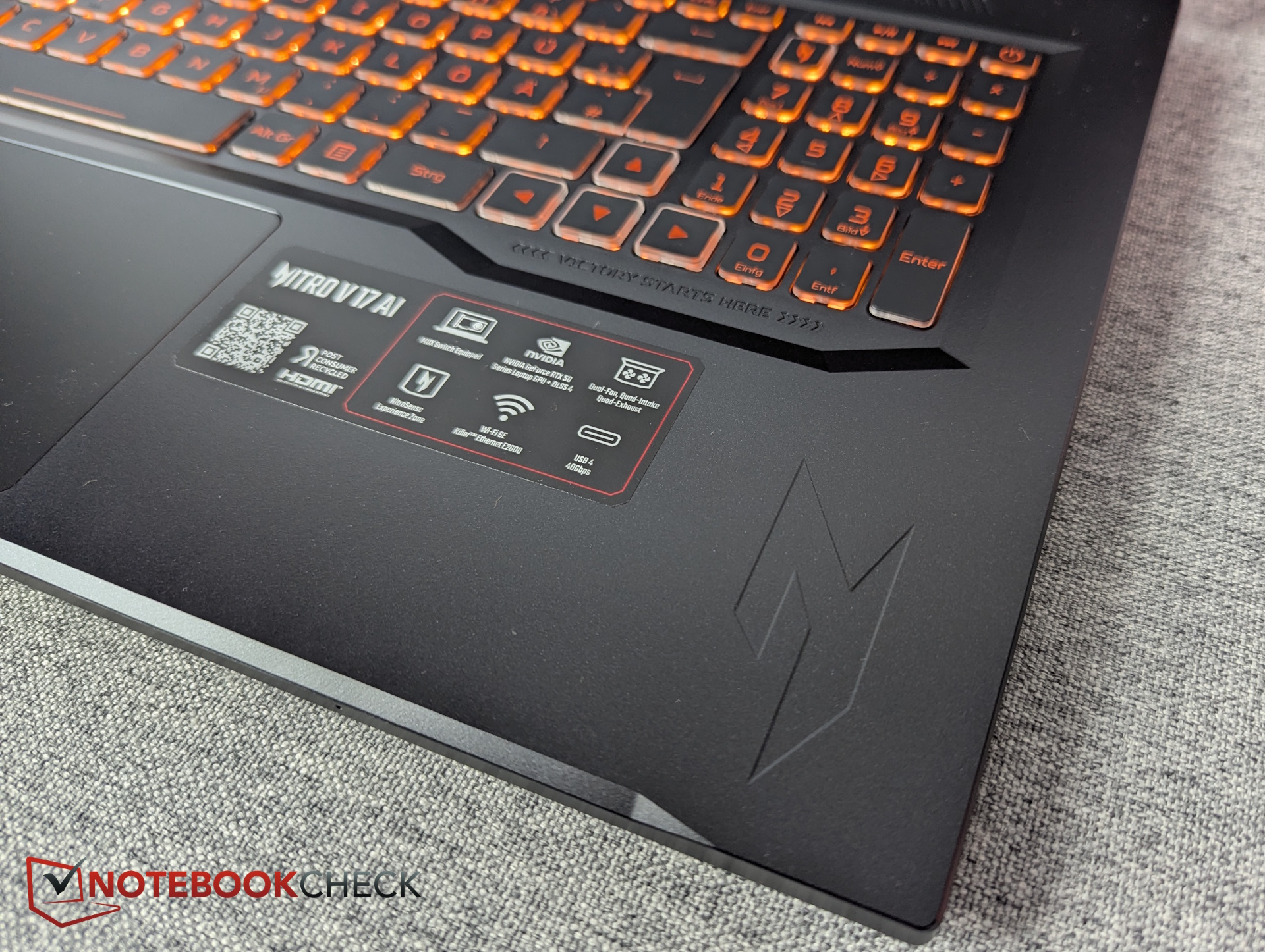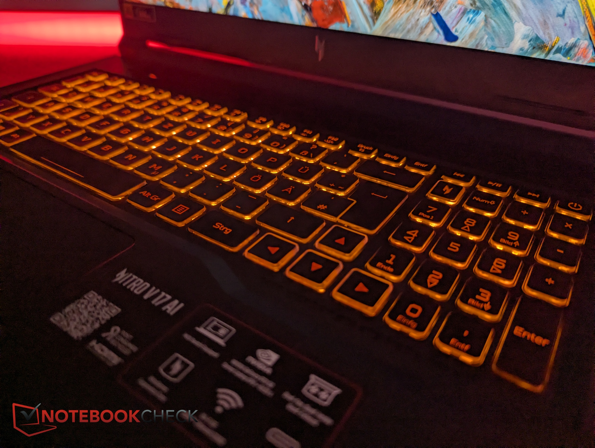 A pesar del chasis de 17 pulgadas, las teclas del teclado numérico son notablemente pequeñas. Las etiquetas de las teclas están impresas en naranja, lo que resulta en un contraste débil. Hay una tecla NitroSense dedicada, y la retroiluminación RGB del teclado se limita a una sola zona.