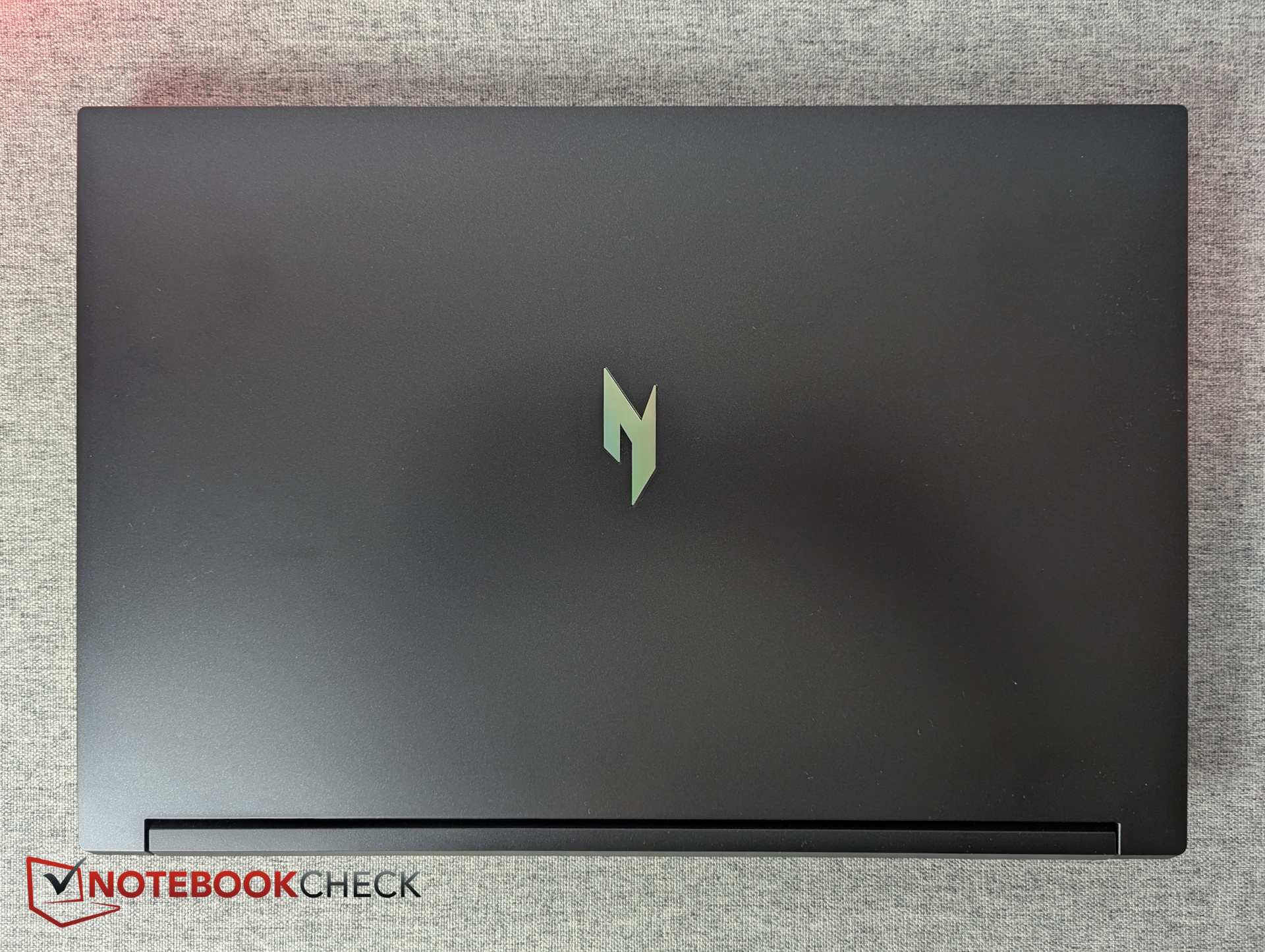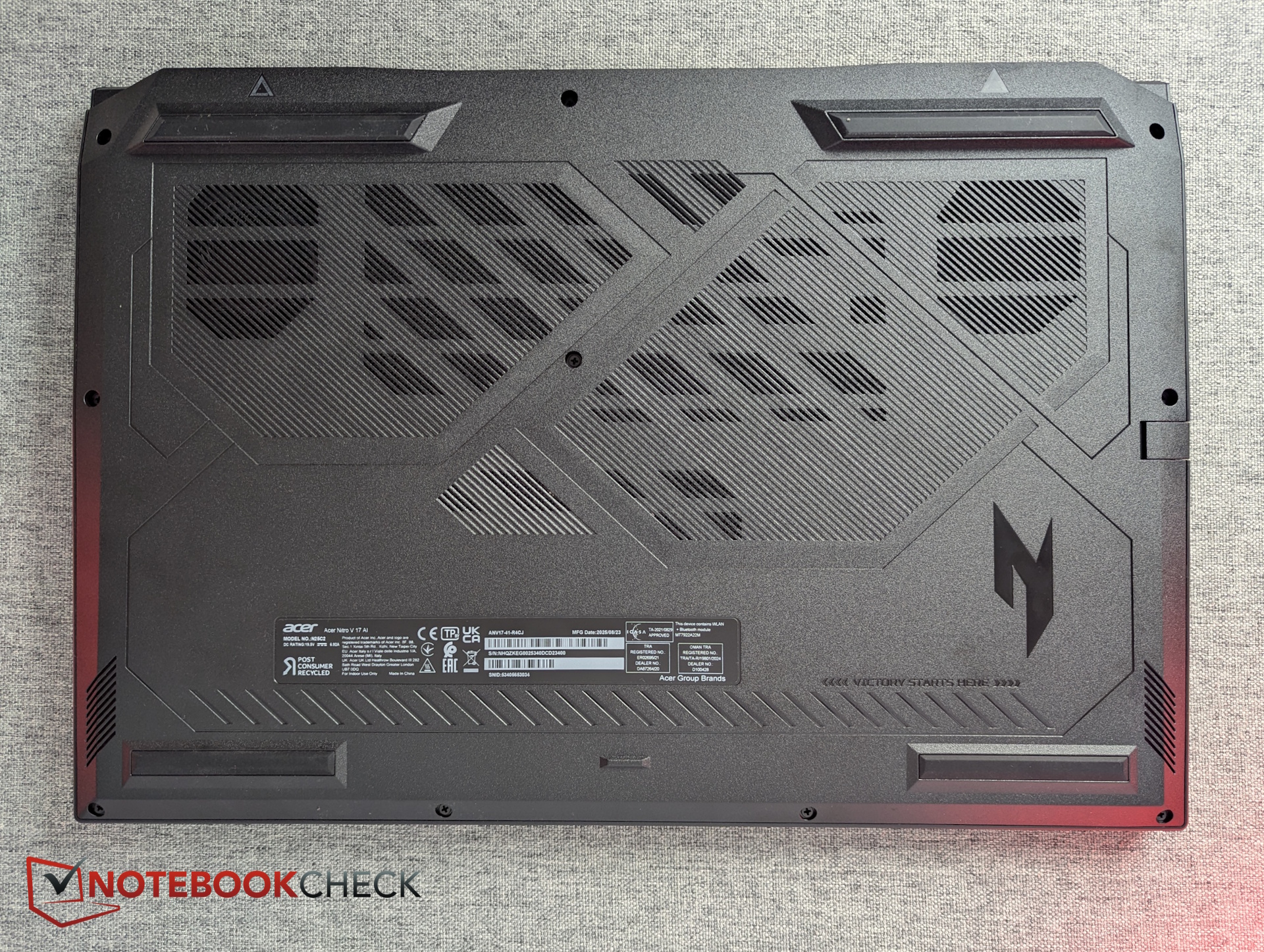 El chasis de plástico negro liso es relativamente delgado para un portátil de 17 pulgadas y se flexiona ligeramente bajo presión, pero no produce ningún chirrido. Las separaciones entre paneles son uniformes y discretas.