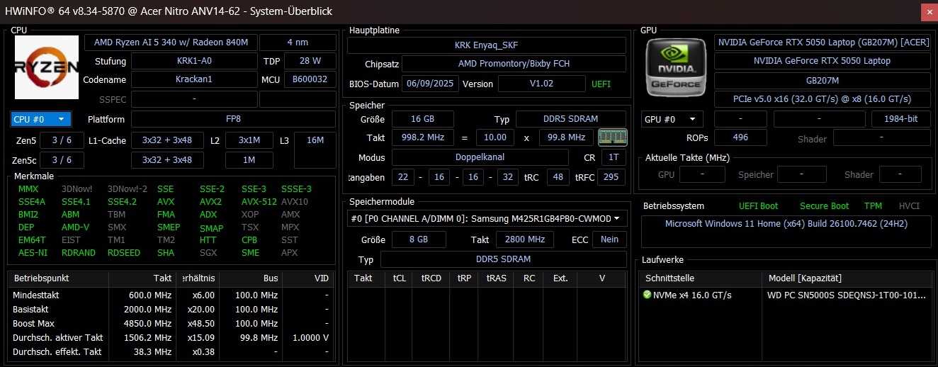 | Acer Nitro V 16 AI ANV16-42-R860 AMD Ryzen 5 240 ⎘ NVIDIA GeForce RTX 5050 Laptop ⎘ 16 GB Memoría, 1024 GB SSD | Amazon: $1,049.00 Precio de catálogo: 1100 EUR | 2.4 kg | 24.5 mm | 16.00" 1920x1200 142 PPI IPS | |