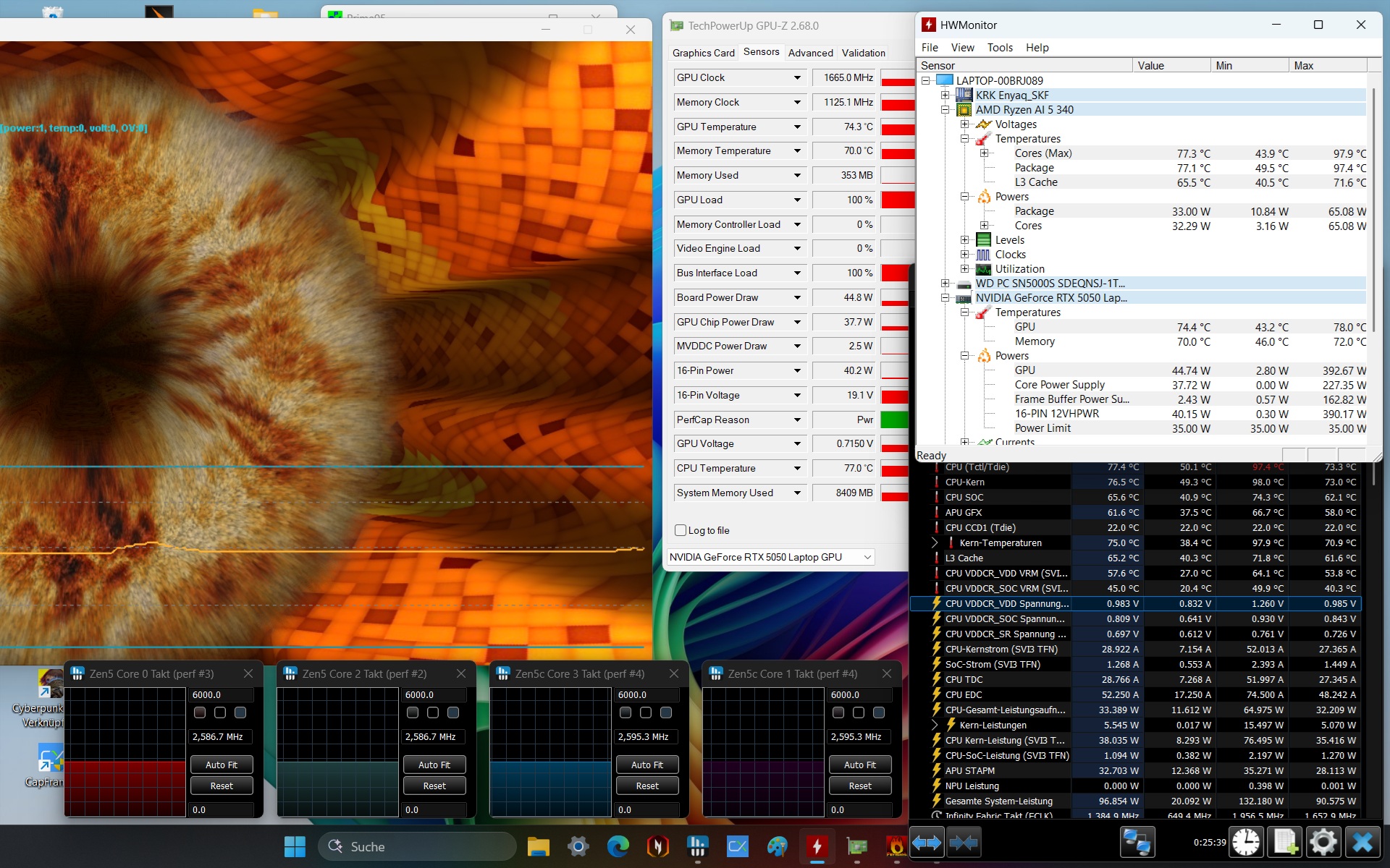 | Acer Nitro V14 AI ANV14-62-R9LT Ryzen AI 5 340, GeForce RTX 5050 Laptop | Acer Nitro V 16 AI ANV16-42-R860 R5 240, GeForce RTX 5050 Laptop | HP Victus 15-fa2160ng i5-13420H, GeForce RTX 5050 Laptop | Lenovo LOQ 15AHP10 R7 250, GeForce RTX 5060 Laptop | Lenovo Legion 5 15AHP G10 R7 260, GeForce RTX 5060 Laptop | Schenker XMG Core 15 (M25) Ryzen AI 7 350, GeForce RTX 5060 Laptop | Razer Blade 14 2025 Ryzen AI 9 365, GeForce RTX 5070 Laptop | Media de la clase Gaming | |