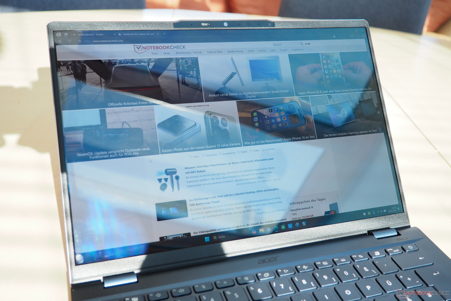 Como ya hemos mencionado, nuestra variante de prueba está equipada con un Core Ultra 5 226V y 16 GB de RAM LPDDR5X-8533 integrada. Acer sólo ha instalado una unidad SSD de 512 GB como almacenamiento masivo del portátil, lo que, para un precio de más de 1.000 dólares, no está totalmente a la altura de los tiempos (hoy en día esperaríamos más de 1 TB). Un brillante panel OLED de 90 Hz se encarga de la reproducción de la imagen, que cuenta con soporte HDR y una resolución de 2.880 x 1.800 píxeles, bastante generosa para un dispositivo de 14 pulgadas. El paquete se completa con Windows 11 Home como sistema operativo.