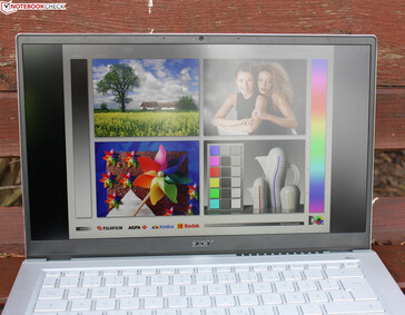 El display IPS Full HD agrada con ángulos de visión estables, una superficie mate, una fuerte reproducción del color y un buen contraste. El brillo máximo es moderado. Los dispositivos de entrada son adecuados para el uso diario, pero las teclas tienen poco recorrido.