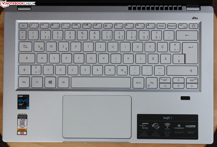 Acer equipa el equipo de 14 pulgadas con un teclado chiclet retroiluminado de un solo nivel. Las teclas planas y suaves ofrecen un recorrido corto y un punto de presión claro. La resistencia proporcionada por las teclas está bien. El teclado no cede en ninguna posición durante la escritura. En general, Acer ofrece un teclado adecuado para el uso diario, con el que es posible escribir rápidamente; sin embargo, parece un poco rígido. El recorrido y el punto de presión deberían ser más pronunciados para una mejor respuesta