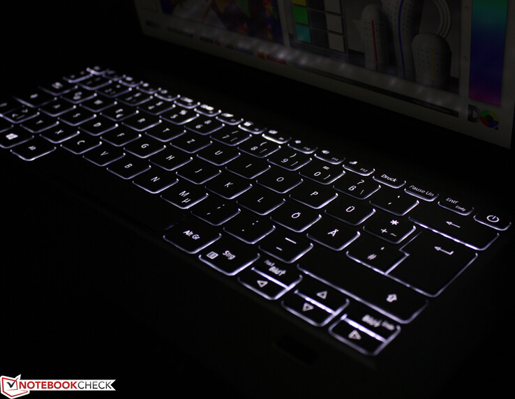 Acer ha equipado su Swift X con un teclado chiclet retroiluminado con un solo ajuste de brillo. Las teclas planas y suaves ofrecen un recorrido poco profundo y un punto de accionamiento algo vago. La respuesta es decente y el área del teclado no cede en ninguna parte mientras se escribe. En general, Acer ha creado un teclado que permite escribir rápidamente durante el uso diario. Sin embargo, aún no se siente como un modelo premium. Para una mejor respuesta, el desplazamiento y el punto de accionamiento tendrían que haber sido más claros.