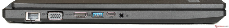 Casi nadie se sorprendería de que las conexiones sean solo un poco más del mínimo requerido. Por ejemplo, dos de los cuatro puertos USB todavía funcionan según el estándar 2.0 más lento y Thunderbolt no existe. En su lugar, se ve favorecido con una conexión VGA antigua junto al HDMI. Uno de los puertos USB 3 se implementa como Tipo C y ofrece DisplayPort, si utiliza el adaptador correspondiente, que desafortunadamente no está incluido. Para los usuarios diestros que desean conectar un mouse externo, los dos puertos USB-2.0 están demasiado adelante, de modo que el cable podría interferir. El lado izquierdo, que tiene todas las otras conexiones a excepción de la potencia, se ve un poco mejor.