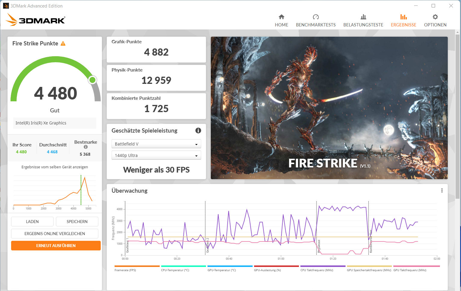 Incluso al principio de la prueba de estrés, que implicaba ejecutar Prime95 y FurMark durante al menos una hora, la CPU (de 1,7 a 2,3 GHz) y la GPU (de 950 a 1.000 MHz) funcionaban a velocidades de reloj relativamente bajas. Incluso se ralentizaron en el transcurso de la prueba. Sin embargo, es crucial mencionar que la prueba de estrés simula una situación extrema y está diseñada para permitirnos evaluar si un sistema es estable a máxima carga.