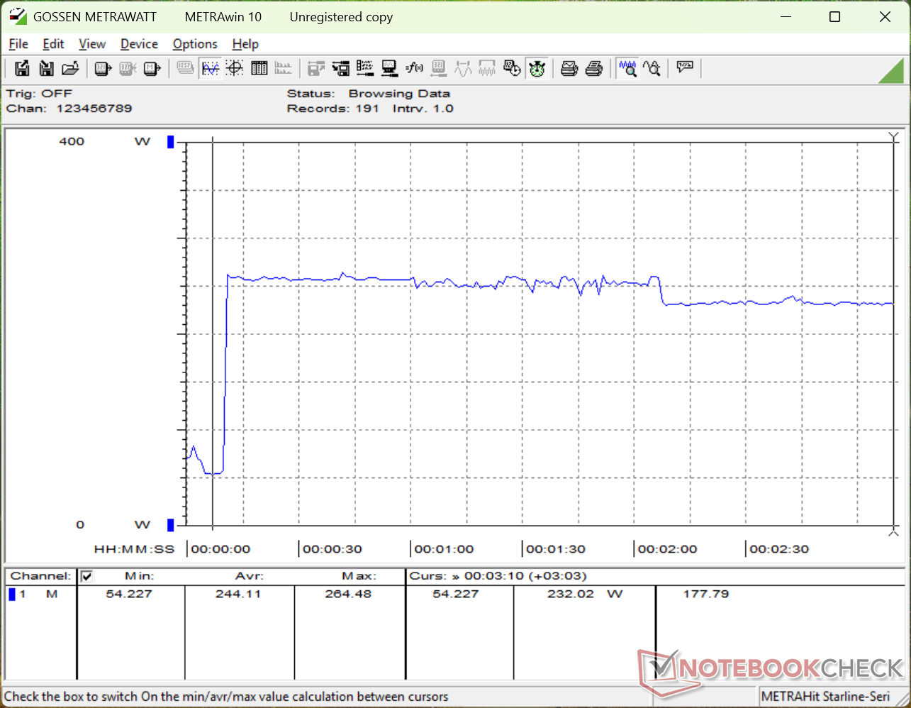 La Core Ultra 9 290HX Plus es entre un 15 y un 25 por ciento más rápida que la Core Ultra 9 275HX precedente, como ya hemos mencionado. Casualmente, nuestro Alienware 16 de 2026 es entre un 15 y un 25 por ciento más exigente que el Alienware 16 de 2025 cuando se estresa la CPU. Ejecutar Prime95 en el último modelo de Alienware consume alrededor de 255 W cuando Turbo Boost es más eficaz o 230 W cuando Turbo Boost se ha estabilizado en comparación con sólo 200 W en el modelo del año pasado. Incluso cuando no se está jugando, el modelo más nuevo es generalmente más exigente en al menos unos pocos vatios más.
