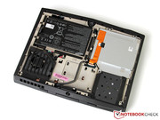 Retirando dos tornillos y empujando la trampilla de servicio es todo lo que hace falta para acceder al interior del M14x. Dentro se ve algo diferente de otros portátiles; en vez de tarjetas de circuito verdes, inicialmente sólo se ven mas cubiertas y tornillos. Una vez se retiran, la mayoría de componentes importantes quedan accesibles para cambiar si se desea. Uno no debería olvidar echar un vistazo debajo de la batería, dónde el están conector mSATA (ya en uso) y la radio WiFi.