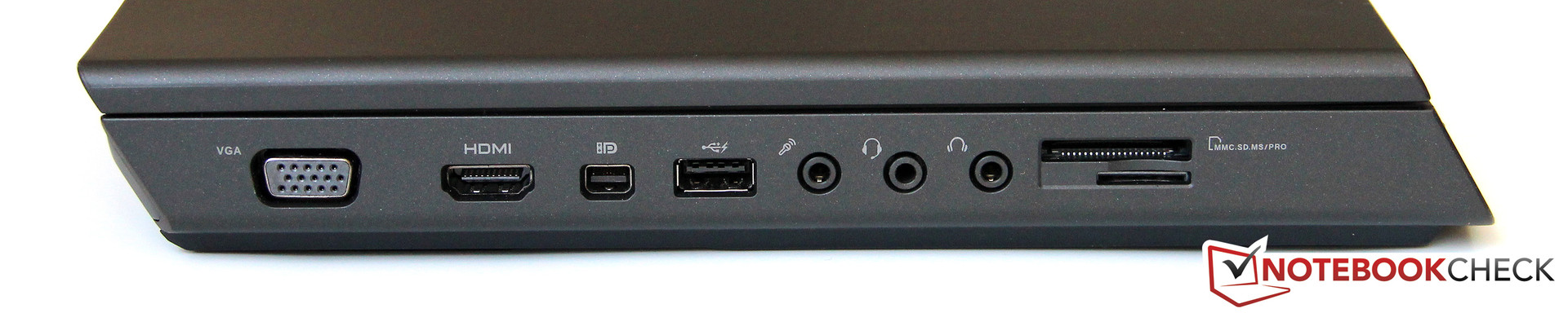 HDMI, Mini DisplayPort y VGA están disponibles para conectarse a displays externos de todo tipo. Mientras que el año pasado criticábamos la falta de ranuras eSATA, Firewire o ExpressCard, queremos matizar dichas declaraciones ahora: Debido a la decreciente distribución de esos interfaces, debería haber cada vez menos compradores que experimenten limitaciones debido a su ausencia.