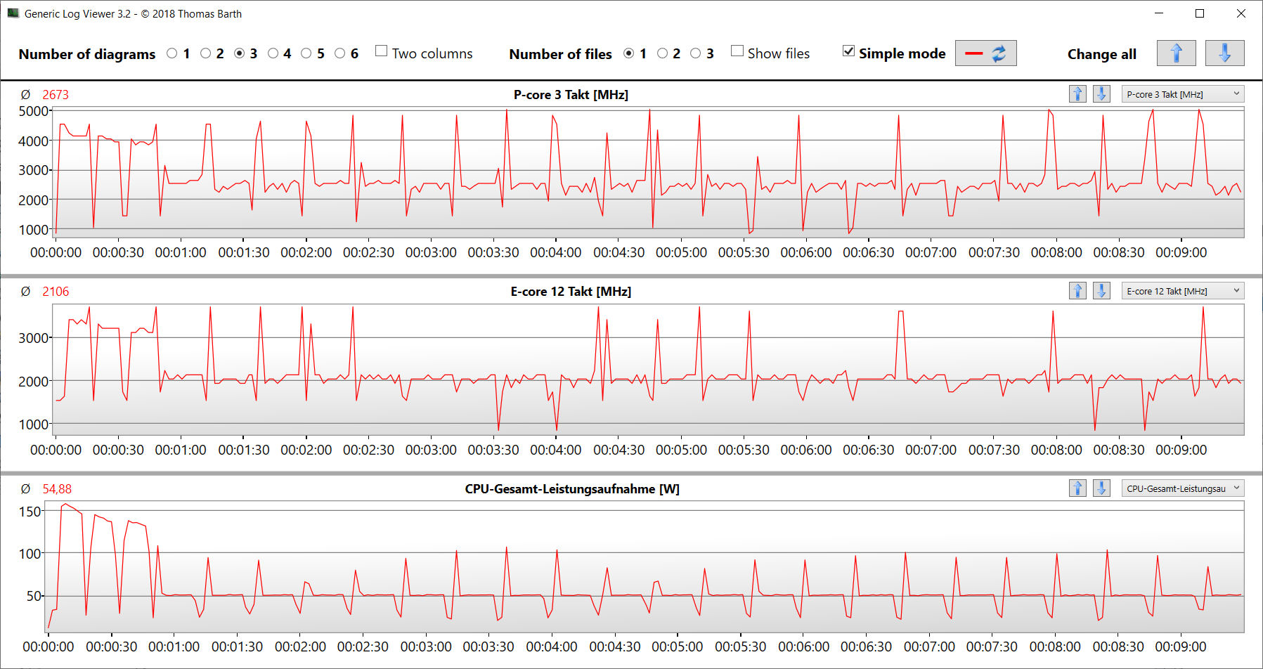 La prueba de estrés (Prime95 y Furmark en funcionamiento continuo) representa un escenario extremo para comprobar la estabilidad del sistema a plena carga. La CPU (P: 4,2 GHz, E: 3,4 GHz) comienza la prueba con velocidades de reloj elevadas. A medida que avanza la prueba, el reloj desciende ligeramente hasta que, al cabo de unos 30 minutos, cae repentinamente a valores inferiores al reloj base. La GPU funciona constantemente a plena potencia.